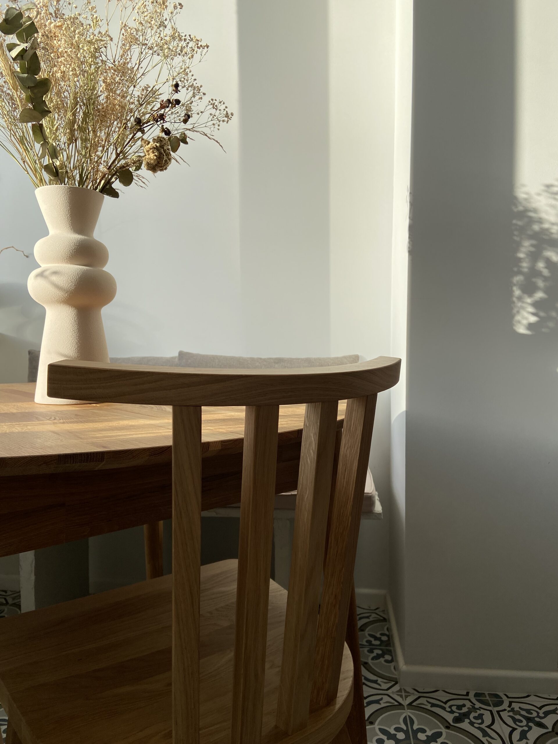Les meubles principaux (table, chaises, étagères…) proviennent de marques éco-responsables, pour un intérieur à la fois durable, pratique et plein de caractère.