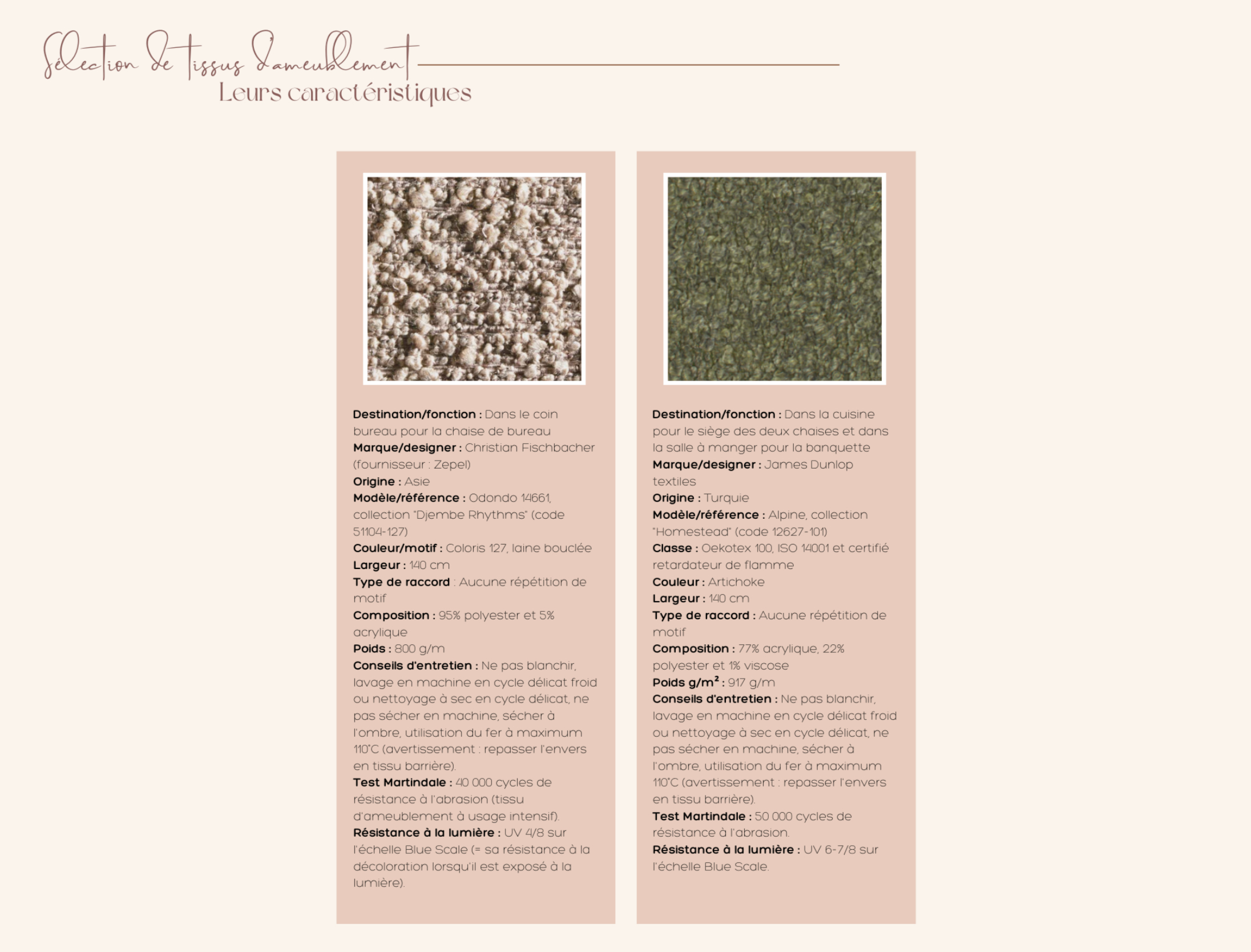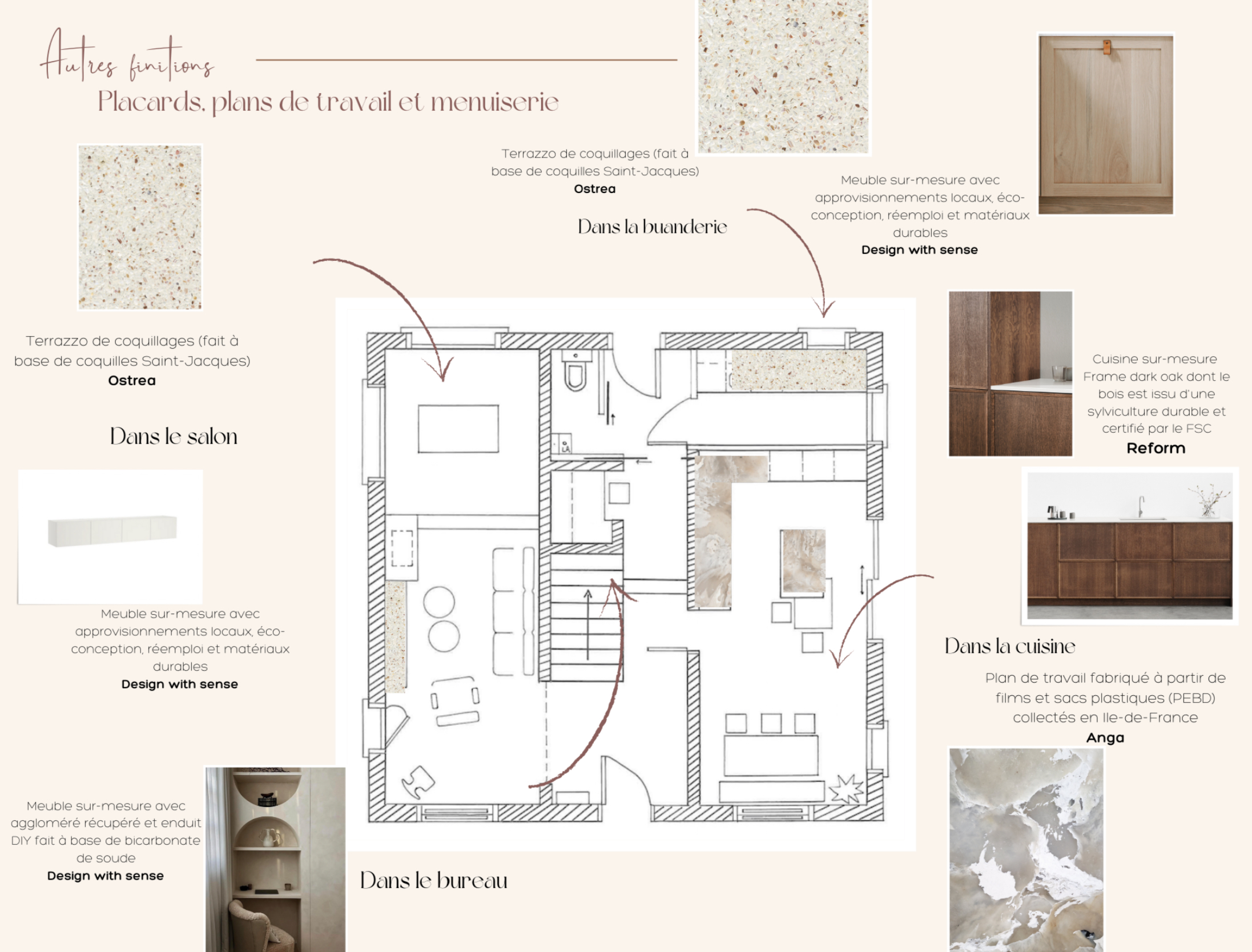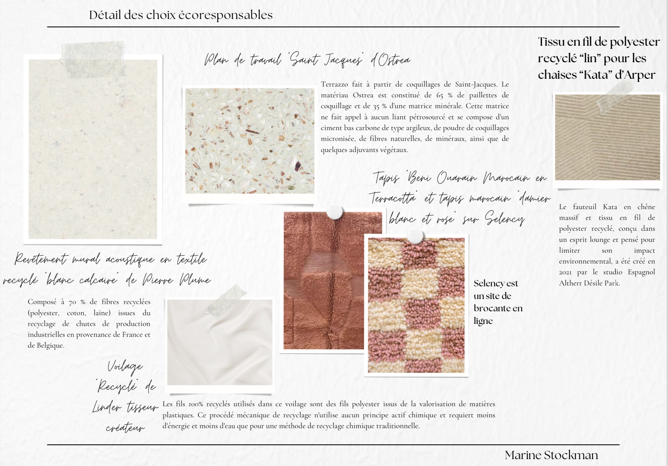 La démarche durable se traduit par un sol en terrazzo de coquillages (coquilles Saint-Jacques), un plan de travail issu de plastiques recyclés en Île-de-France, et des meubles sur-mesure pensés en circuit court, avec des matériaux durables et du réemploi. Les peintures utilisées sont naturelles, biosourcées et dépolluantes, sélectionnées auprès de marques engagées comme Biologement, Colibri ou Conscient, pour un intérieur sain et respectueux de l’environnement. Le choix des textiles participe également à cette exigence : le tissu du fauteuil dans le salon est certifié Oeko-Tex Standard 100 et conforme à la norme REACH, garantissant l’absence de substances toxiques pour le corps et l’environnement. Le canapé est habillé d’un tissu uni en coton et viscose, dont 30 % issus du recyclage, labellisé Oeko-Tex et Global Recycled Standard. Le coton utilisé est biodégradable, durable, renouvelable, peu gourmand en eau et cultivé avec une réduction significative des pesticides. Enfin, dans la cuisine, un tissu ignifuge, hautement résistant à l’abrasion et à la lumière a été sélectionné pour faire face aux usages intensifs d’une famille et à la forte luminosité apportée par la grande baie vitrée. Un intérieur pensé pour durer, avec style et conscience.