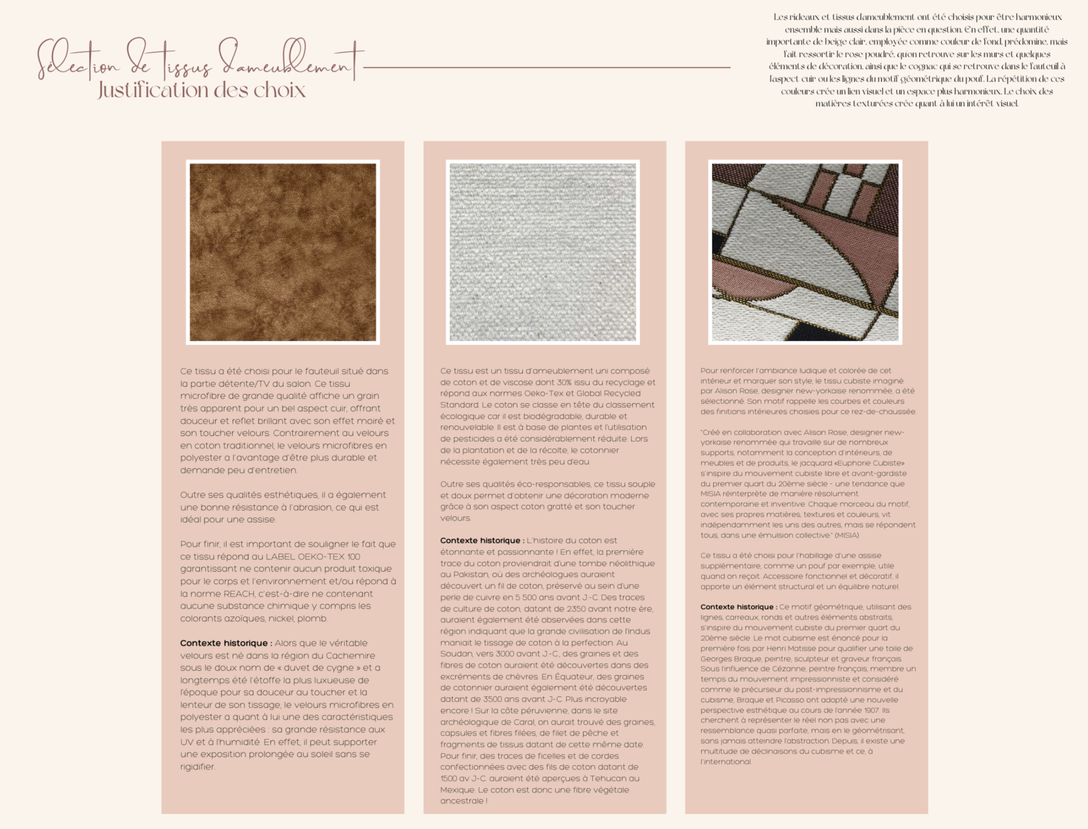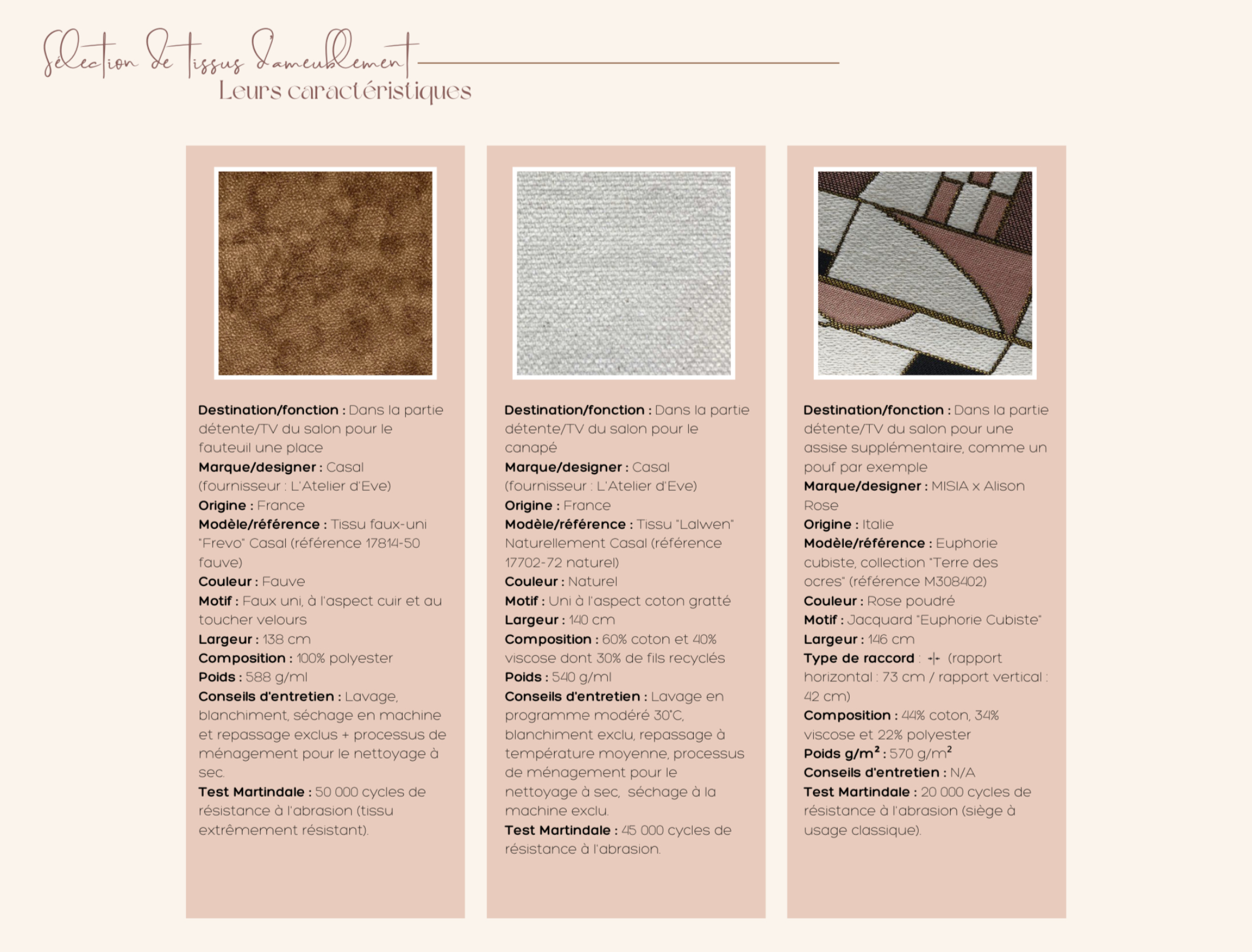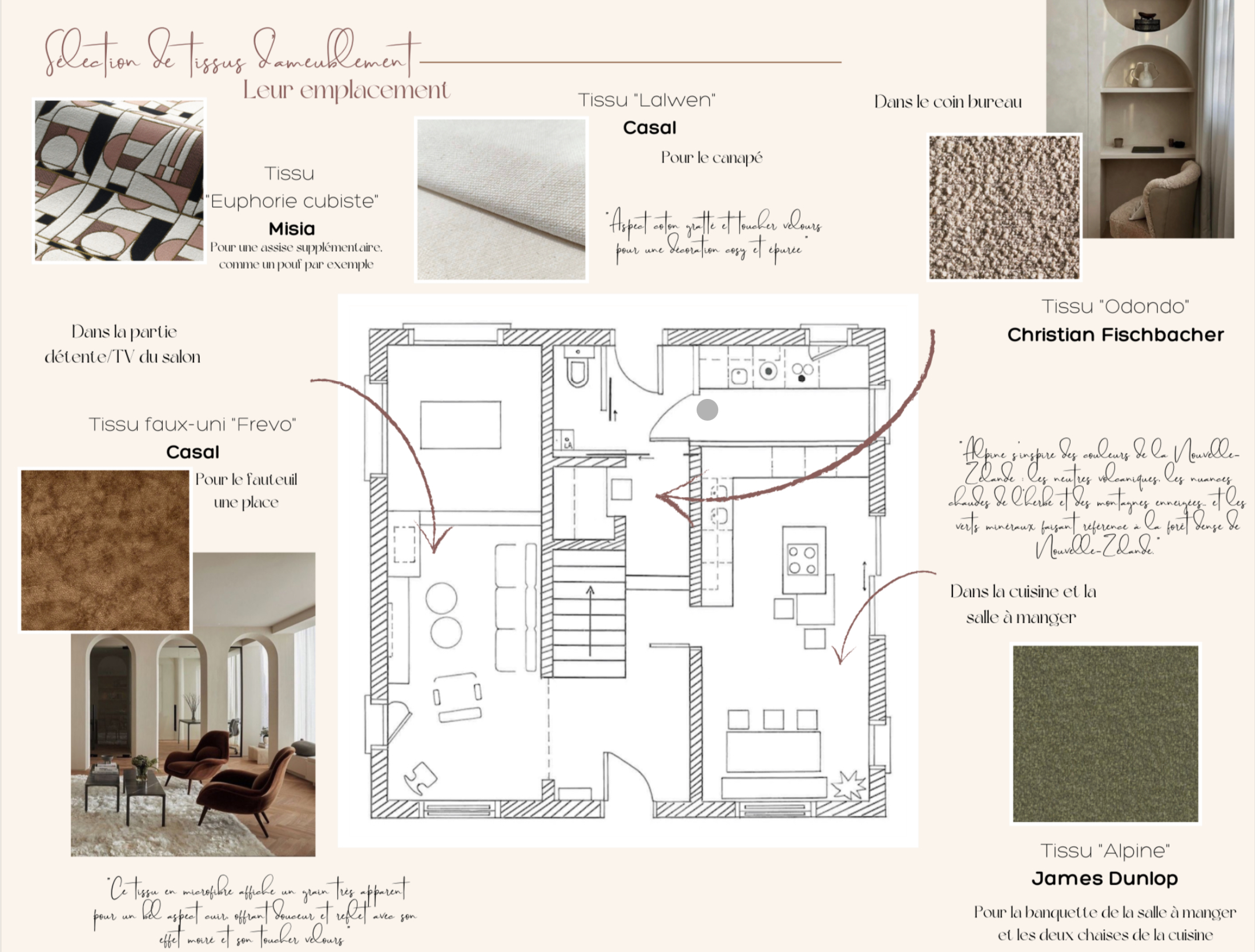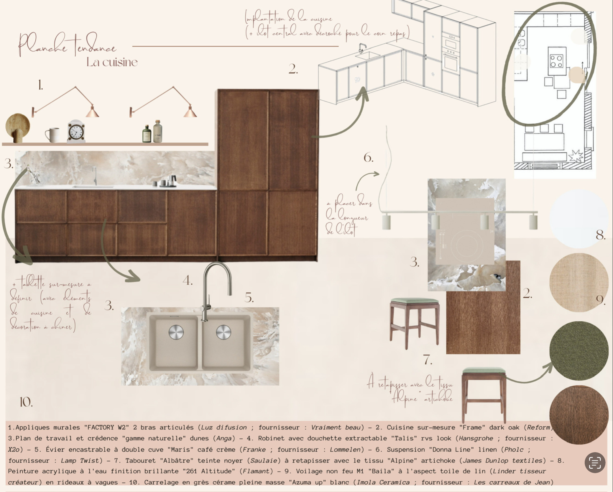 La démarche durable se traduit par un sol en terrazzo de coquillages (coquilles Saint-Jacques), un plan de travail issu de plastiques recyclés en Île-de-France, et des meubles sur-mesure pensés en circuit court, avec des matériaux durables et du réemploi. Les peintures utilisées sont naturelles, biosourcées et dépolluantes, sélectionnées auprès de marques engagées comme Biologement, Colibri ou Conscient, pour un intérieur sain et respectueux de l’environnement. Le choix des textiles participe également à cette exigence : le tissu du fauteuil dans le salon est certifié Oeko-Tex Standard 100 et conforme à la norme REACH, garantissant l’absence de substances toxiques pour le corps et l’environnement. Le canapé est habillé d’un tissu uni en coton et viscose, dont 30 % issus du recyclage, labellisé Oeko-Tex et Global Recycled Standard. Le coton utilisé est biodégradable, durable, renouvelable, peu gourmand en eau et cultivé avec une réduction significative des pesticides. Enfin, dans la cuisine, un tissu ignifuge, hautement résistant à l’abrasion et à la lumière a été sélectionné pour faire face aux usages intensifs d’une famille et à la forte luminosité apportée par la grande baie vitrée. Un intérieur pensé pour durer, avec style et conscience.