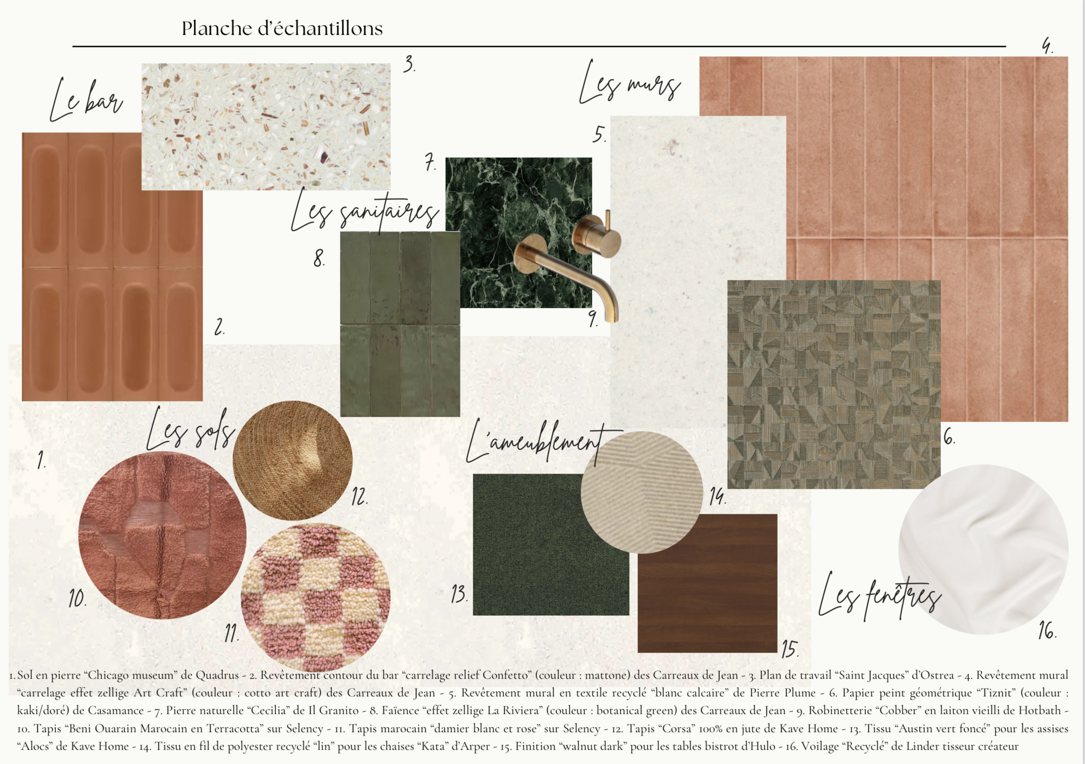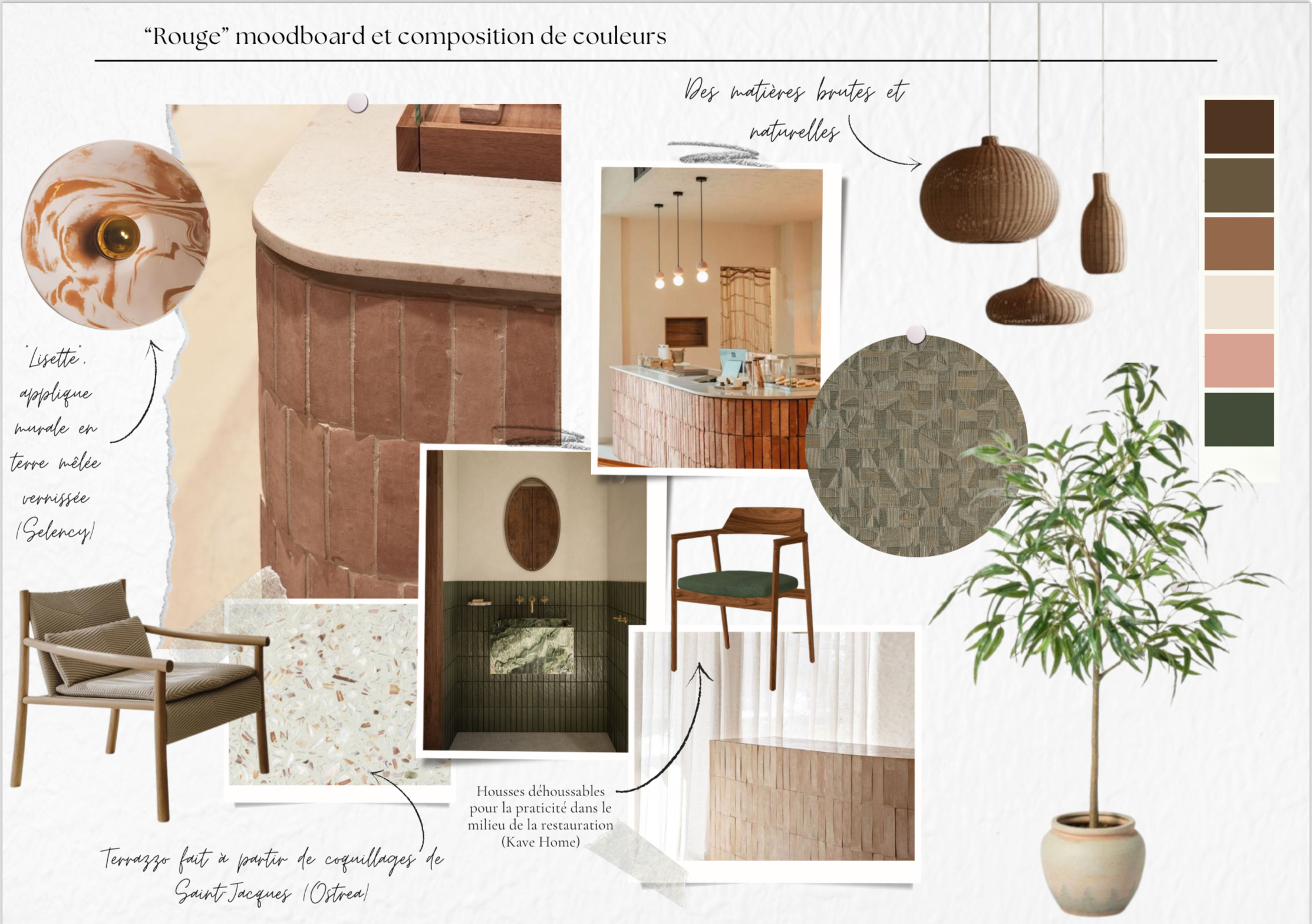 L’identité visuelle se traduit par une palette de couleurs chaudes (terracotta, verts doux) et des matériaux naturels (bois, pierre, textile recyclé), pour un effet à la fois joyeux et apaisant. L’ambiance est renforcée par un arbre central majestueux, des luminaires chinés en seconde main, et un mobilier sélectionné auprès d’artisans et marques engagées. L’éco-responsabilité guide chaque choix : plan de travail en coquillages recyclés, revêtements acoustiques en textile récupéré, toilettes à faible impact, voilages en fils recyclés, et gestion optimisée de l’éclairage naturel.