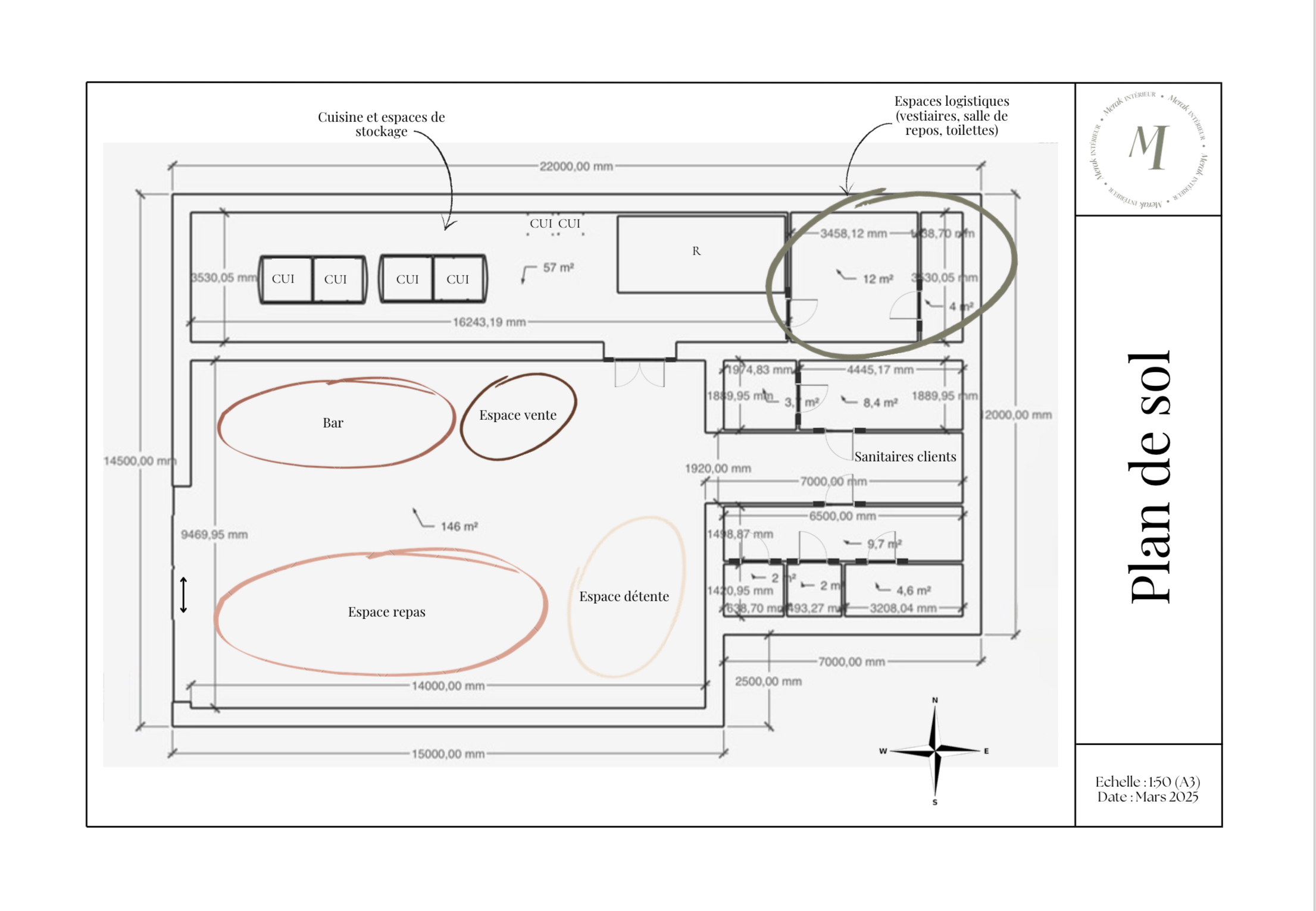 Le projet repose sur une stratégie d’aménagement fluide, optimisant le parcours client sans service au bar ni comptoir d’accueil, tout en favorisant la proximité avec les serveurs et la mise en valeur des produits maison (café, pâtisseries). Les zones sont bien définies : coin cosy, espace repas, bar opérationnel, coin vente, et cuisine fermée.