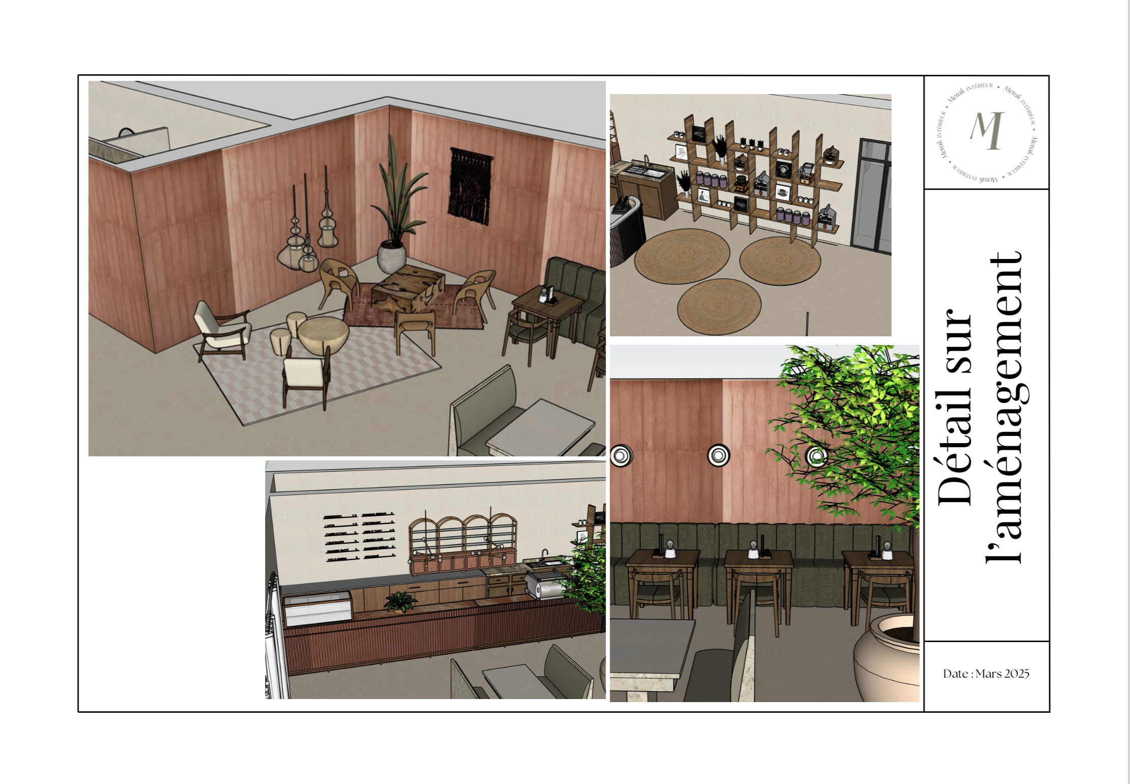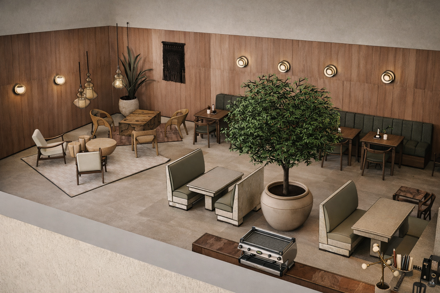 Pour ce projet de coffee shop, j’ai conçu un aménagement global et sur-mesure d’un espace de restauration à l’identité forte, pensé comme un lieu de vie accueillant, chaleureux et accessible à tous. Le brief du client était clair : créer un lieu intemporel, loin des tendances éphémères, combinant fonctionnalité, durabilité et atmosphère conviviale.